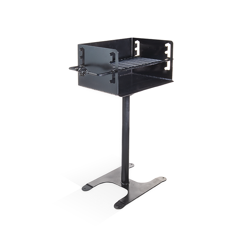 Created for campgrounds, parks, and day-use areas, this hand-crafted grill can also be used in backyard applications. Standing 36” tall, made from 3/16” steel plate including 5/8” steel adjustable BBQ grate this grill will stand the test of time. Coated with heat resistant paint, this grill can either be bolted or set in concrete for safety and security.